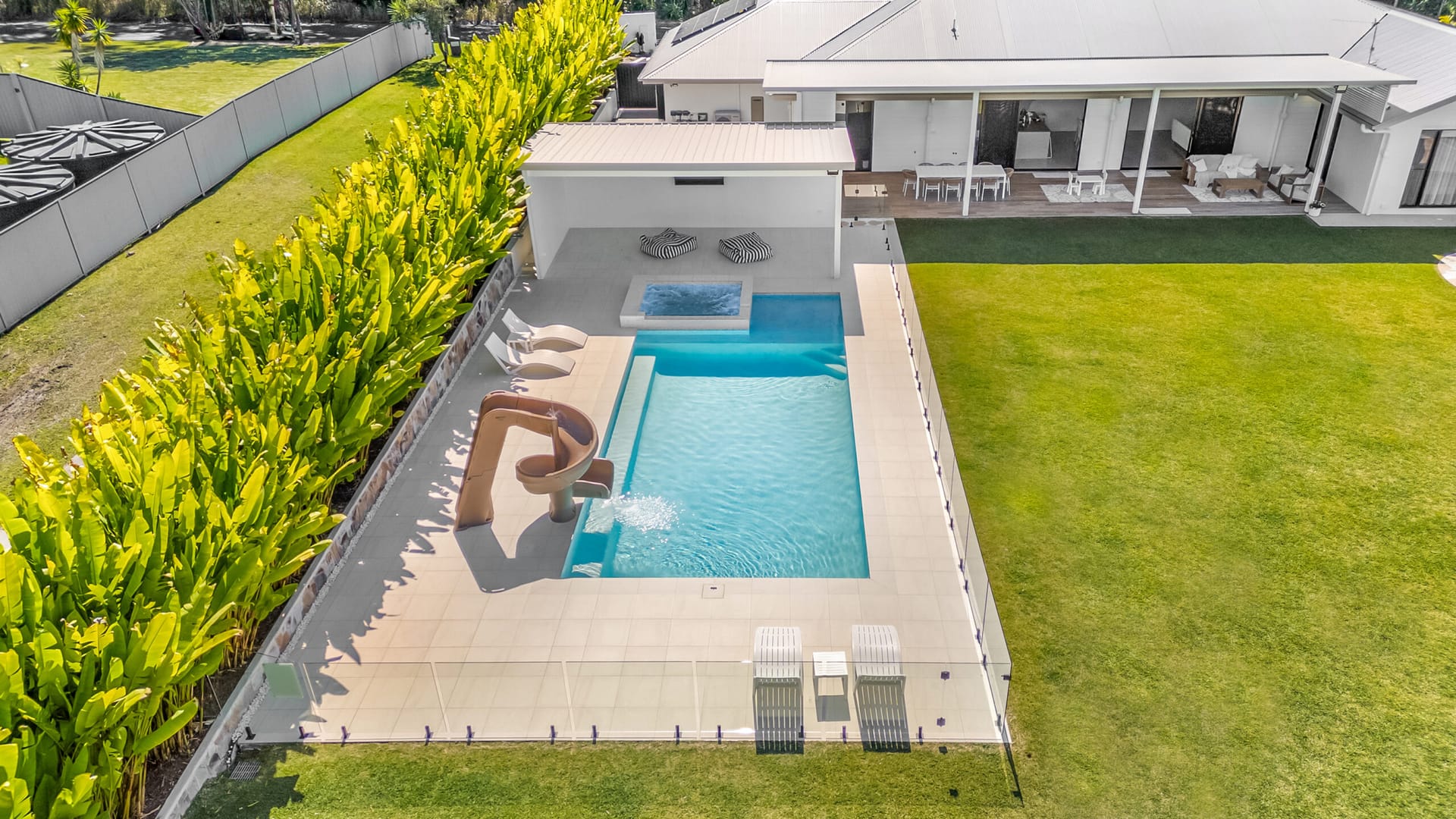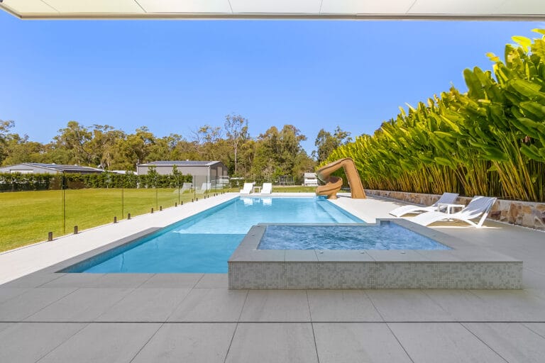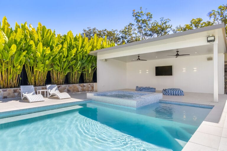The vision was to create a seamless outdoor space where family and friends could gather in comfort. Every element was chosen for both form and function — from the soft-edged pool shape that mirrors the home’s relaxed vibe to the neutral tones that keep the space cool and inviting.